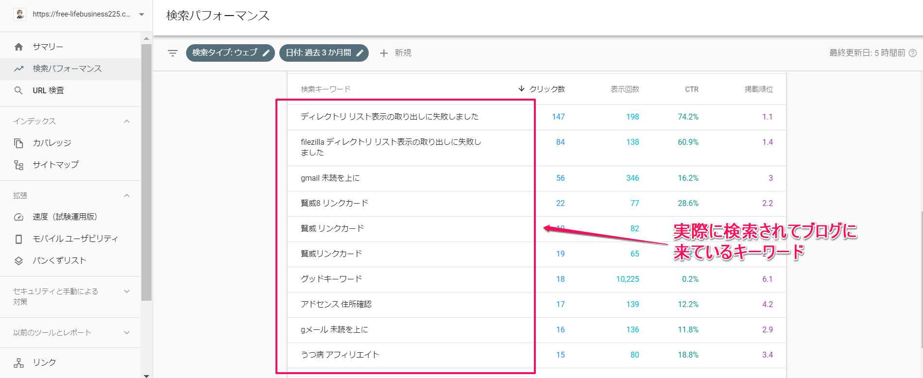 ↑実際にブログにどんなキーワードで検索されているのか、そしてそのキーワードでは検索結果では何位なのか、クリック数はどのぐらいなのかこういうのがサーチコンソールで見ることができます。
